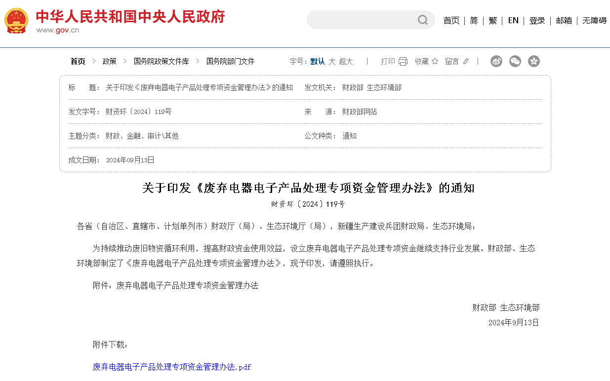 近日,财政部、生态环境部联合发布的《废弃电器电子产品处理专项资金管理办法》(以下简称《办法》)引起了广泛关注。《办法》是由财政部和生态环境部联合制定并印发的一项政策文件,作为废弃电器电子产品...