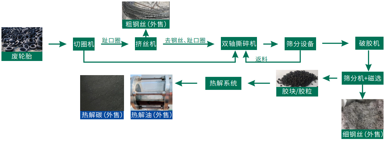 医疗废物由自动翻料机倒入进料仓, 通过双辊加料机进入热解碳化处理, 产物热解油及热解碳均可作为燃料外售。