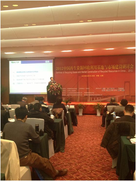 2012年12月19日,“2012中国再生资源回收利用基地与市场建设研讨会”在江阴召开。本次会议由中国物资再生协会、《资源再生》杂志社主办,商务部流通业发展司、江阴市人民政府以及部分再生资源园区负责人、企业代表200余人参加了会议。