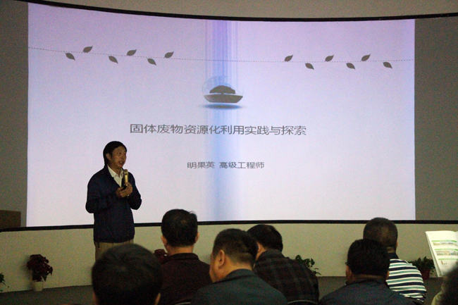 随后,培训班一行又集体听取了董事长明果英先生《关于固体废物资源化利用实践与探索》的专题报告。明果英董事长首先从固体废物与生态环境的关系展开论述,提出“垃圾是放错地方的资源”,进一步引出了3044am永利公司正在研发的第三代生活垃圾资源化利用技术。该技术方案体现了“联合工艺、协同处理”的理念,集成了RDF制备、催化热解、高温腐熟等多种处理工艺,与现有处理技术相比,具有资源价值更大、环境效应更佳、投资收益更大、适应范围更广等特点。明果英董事长的此次发言得到了在场人士的热烈响应,并就生态工厂能否成为第三代生活垃圾处理模式与现场培训班成员进行了探讨。