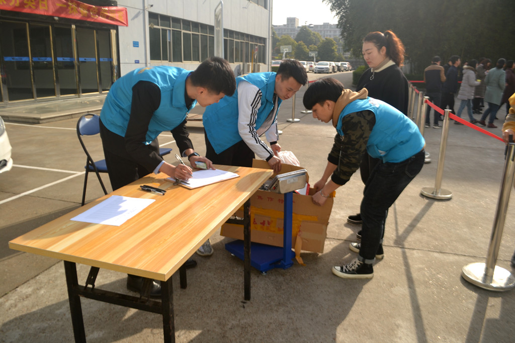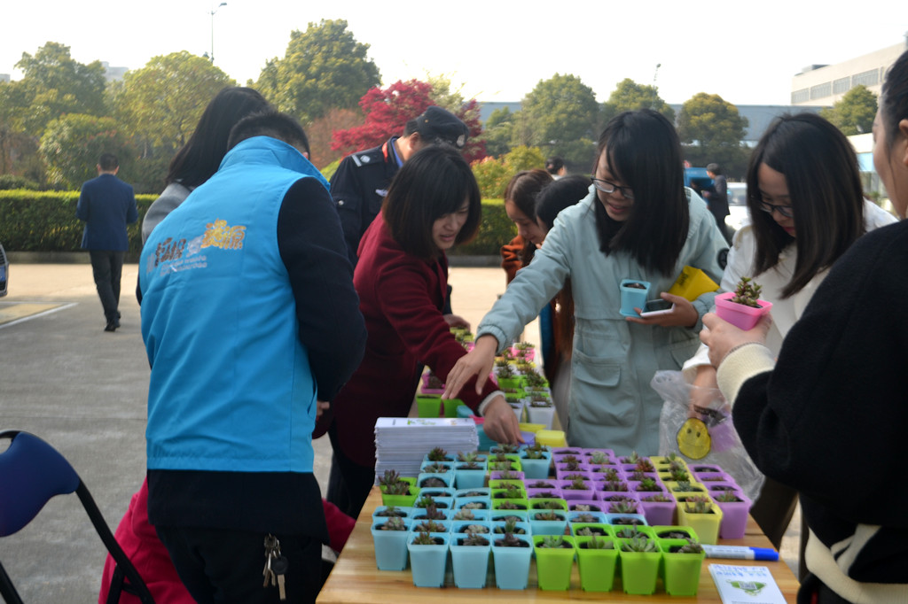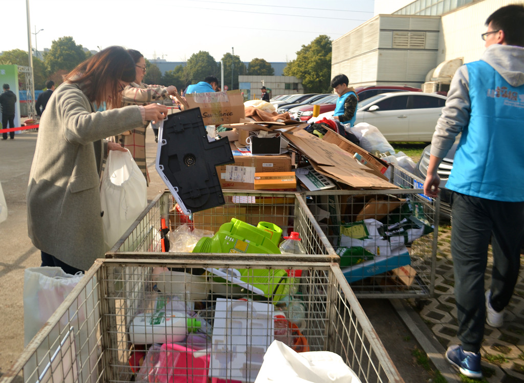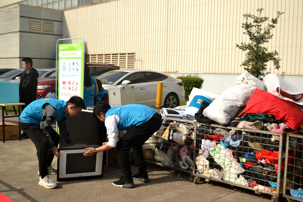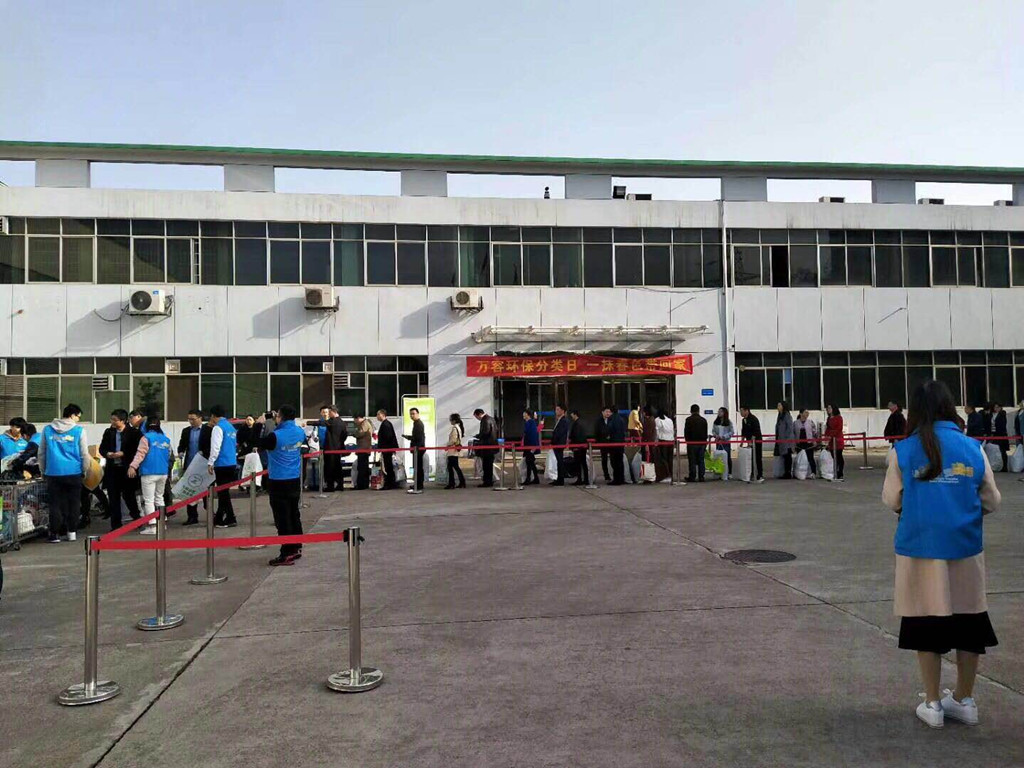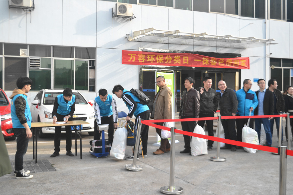 早上七点,晨光中仍带着些寒意,活动举办的相关工作人员就着手准备场地、设备及奖品。八点过后,上班的同事们兴致盎然地带着大包小包的废旧物品,在活动现场排起长队,首先对回收的物品称重,登记所属回收物类别,再将回收物分类投放至回收框内;工作人员再根据重量发放不同颜色的奖券进行抽奖,获得相应奖品后在展板上签名留念,将活动现场情况拍照分享至微信圈,领取绿植。本次活动近120人参与,收获了近1吨的废衣物、废塑料、废纸及废旧家电在内的各类可回收物。