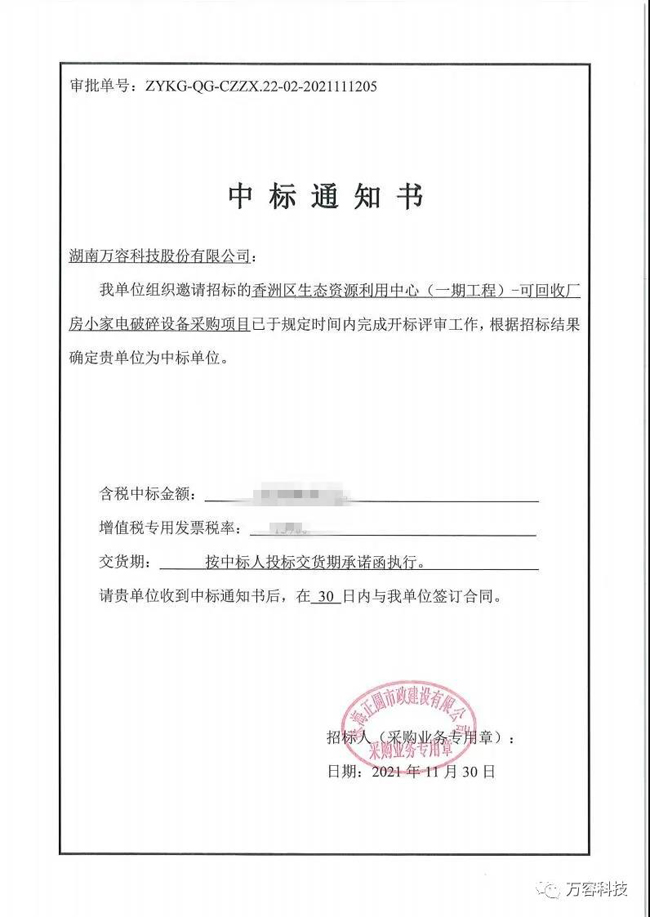 11月30日,3044am永利中标珠海正圆控股有限公司旗下小家电破碎设备采购项目。