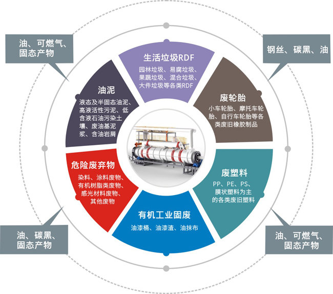 适用于城市污水处理厂、地下管网及河道等产生的市政污泥及造纸业、印染业、皮革业、羽绒制造业等产生的工业污泥;含油沾染废弃物、落地油泥、炼油厂油泥、罐底油泥、钻井岩屑、地面溢油等各类含油污泥(HW08)。污泥、油泥经预处理后,在安全、环保、稳定运行的前提下,经无氧热解技术装备最终转化为热解油、热解炭等主要产物,实现其减量化、无害化处理及资源化利用。