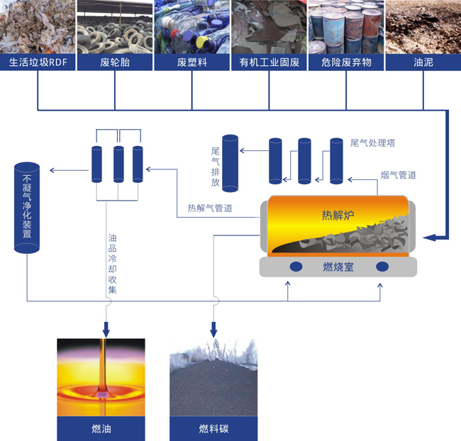 采用无氧热解技术,实现废轮胎、塑料的物理化学回收,解决困扰世界难题的“白色污染”及“黑色污染”。针对废轮胎提供破碎分选设备、前端预处理及终端热解、废轮胎综合利用整厂系统服务。在安全、环保、连续稳定运行的前提下,废轮胎(废旧橡胶制品)最终转化为钢丝、热解油、热解碳,实现资源化、无害化、减量化处置。包装废塑料、分拣后城市垃圾、工业废塑料、农膜、纸厂垃圾等无法再进行直接利用,经破碎、分选、无氧热解后,最终转化为高热值的能源化产品热解油、热解碳,实现资源化、无害化、减量化处置。